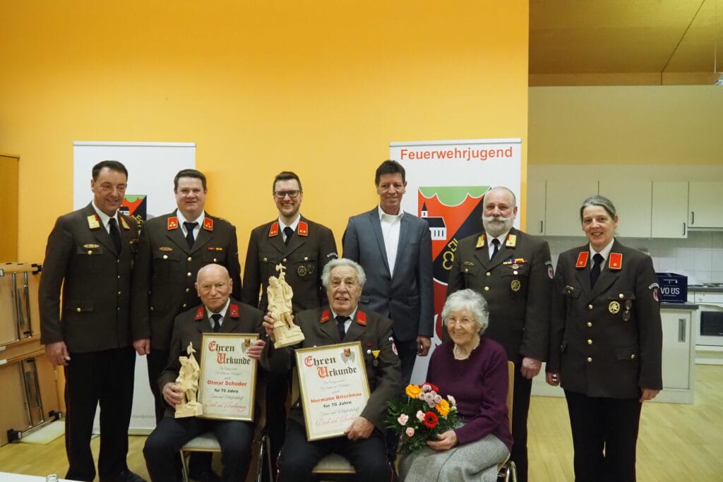 Ein wichtiger Punkt der Versammlung waren die Ehrungen langjähriger Mitglieder. Für 40 Jahre Mitgliedschaft wurden Christian Bitschnau und Joachim Schönfelder ausgezeichnet. Für beeindruckende 70 Jahre Zugehörigkeit zur Feuerwehr erhielten Hermann Bitschnau und Otmar Schoder eine Ehrung. Zudem wurden die fleißigsten Probenbesucher für ihr besonderes Engagement gewürdigt.